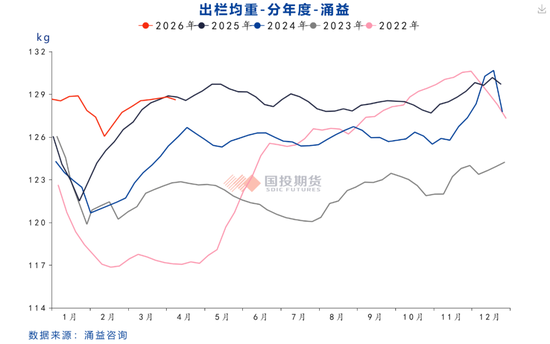 一季度生猪出栏量同比增速2.8%,而一季度猪肉产量同比增速4.2%,猪肉产量增速高于出栏量的增速,主要由于生猪出栏体重也在同比增长。证实涌益参议统计数据,2026年一季度生猪出栏体重处在畴昔5年同时最高水平,浮现生猪滋生企业在春节后猪价快速下落经由中并未出现存效降重。