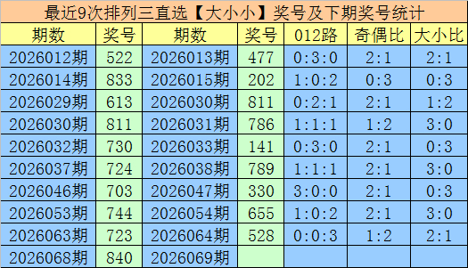1.摆设三第2026068期奖号开出840,大小直选散播为:大小小,在历史开奖中直选【大小小】散播已开出961期,闻喜策略在前9次直选【大小小】散播中,出现奖号为:522-833-613-811-730-724-703-744-723,组三开出4期,组六开出5期。