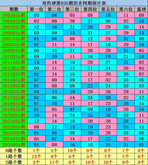 第六位:历史同时0路红球开出:21、30、33;1路红球开出;25、28、31;2路红球开出;11、20、26、29、32,红球012路个数比为7:7:9,客岁同时开出1路奖号之后,本年同时防1路红球再出,参考红球25。