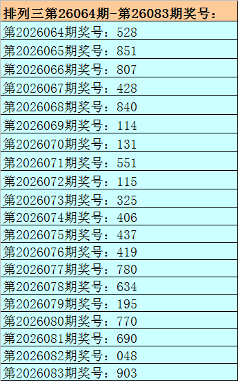 1.摆列三最近十期区分开出号码:406-437-419-780-634-195-770-690-048-903,其中有5期奖号开出了上期的重叠号码,本期瞻望第2026083期奖号:903中有重号,参考号码:0。