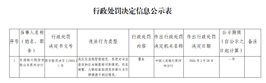 3月6日金融一线音信,据中国东谈主民银行黑河市分行行政处罚决定信息公示表表示,交通银行股份有限公司黑河分行因违背反洗钱惩处限定,存在对国法查冻扣后未作念重新识别情况,存在无为、大额柜面取现等十分活动尽责探望不到位情况,被警告。