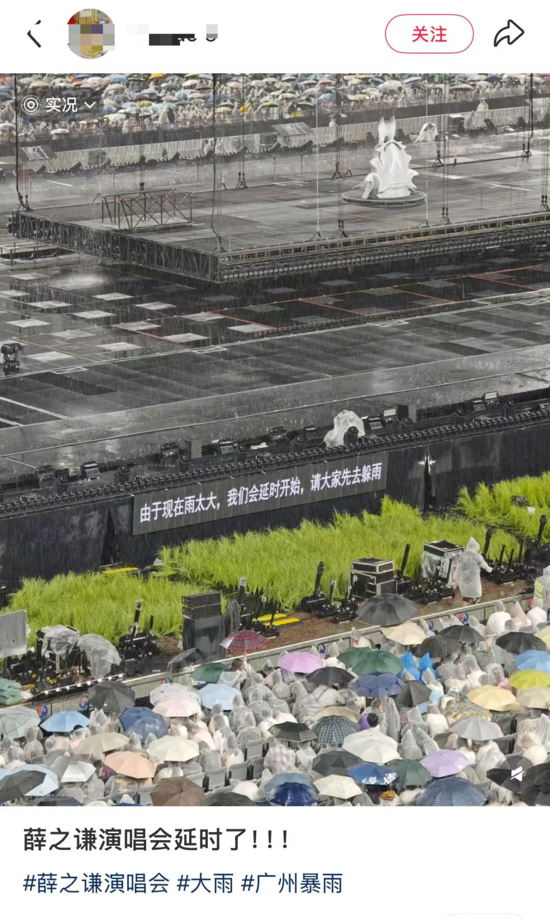 3月29日晚,薛之谦“万兽之王”巡回演唱会-广州站第六场在河汉体育中心举行。据现场歌迷反馈,因广州下昼突发大雨,演唱会启动约莫一小时后,现场部分灯光和荧光棒遴选配置受到影响出现故障。为了给歌迷更好的体验,薛之谦就地向寰宇示意,本场演唱会“免费”,并给寰宇“退票”。