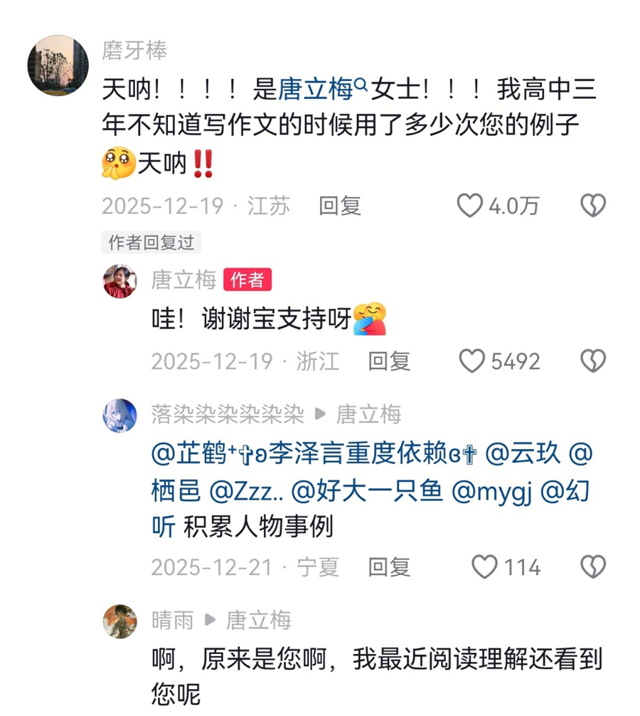 在她的短视频下,有这样一条带着咋舌号的褒贬:“天呐!是唐立梅女士!我高中写稿文不知用了若干次您的例子!”